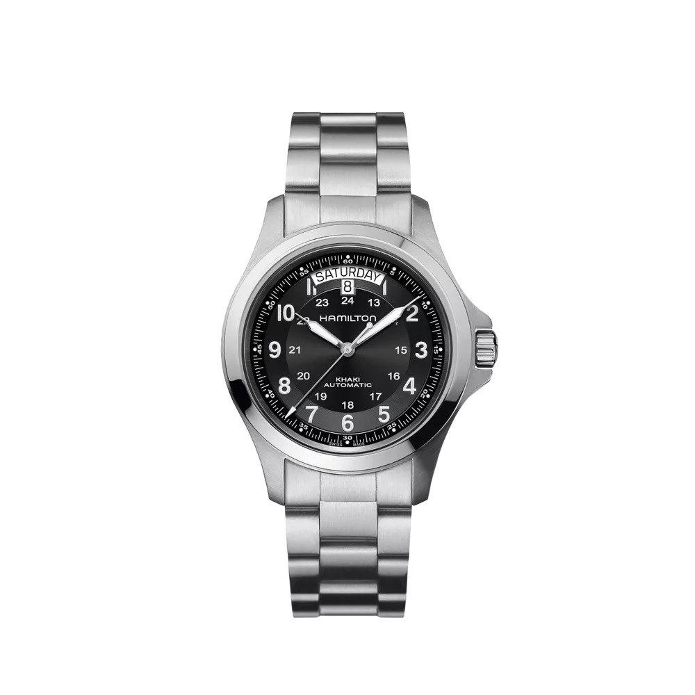 De militaire tijd is opvallend aanwezig op de wijzerplaat van de Khaki Field King Auto, wat het militaire erfgoed van deze stijlvolle Hamilton benadrukt. Speciaal ontworpen kroonbeschermers zorgen ervoor dat de kroon altijd veilig is. Long live the king.