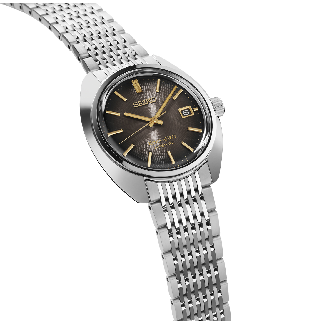De wijzerplaat van het King Seiko-model combineert een fijn reliëfpatroon met een intens grijs kleurverloop, wat een gevoel van diepte en verfijning creëert. Een ontwerp dat ertoe verleidt om het horloge ook van heel dichtbij te bekijken. De delicate schoonheid van het motief wordt versterkt door logo, wijzers en indexen die in goudkleur zijn uitgevoerd. Het stralende contrast met de wijzerplaat straalt elegantie en verfijning uit.