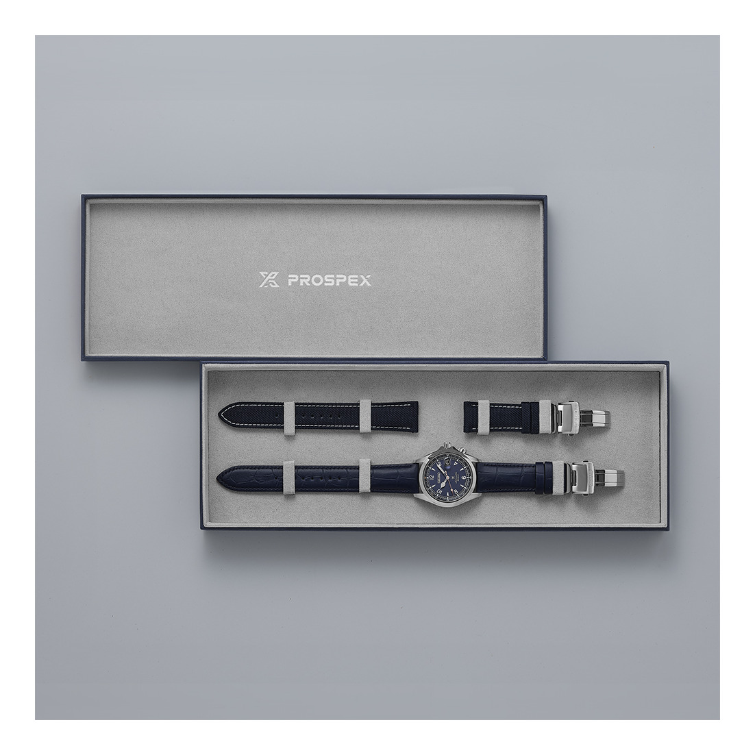 Wordt geleverd met twee banden: een elegante blauwe kalfslederen strap (met krokodillenstructuur) én een donkerblauwe nylon strap—allemaal verpakt in een speciale limited edition box.