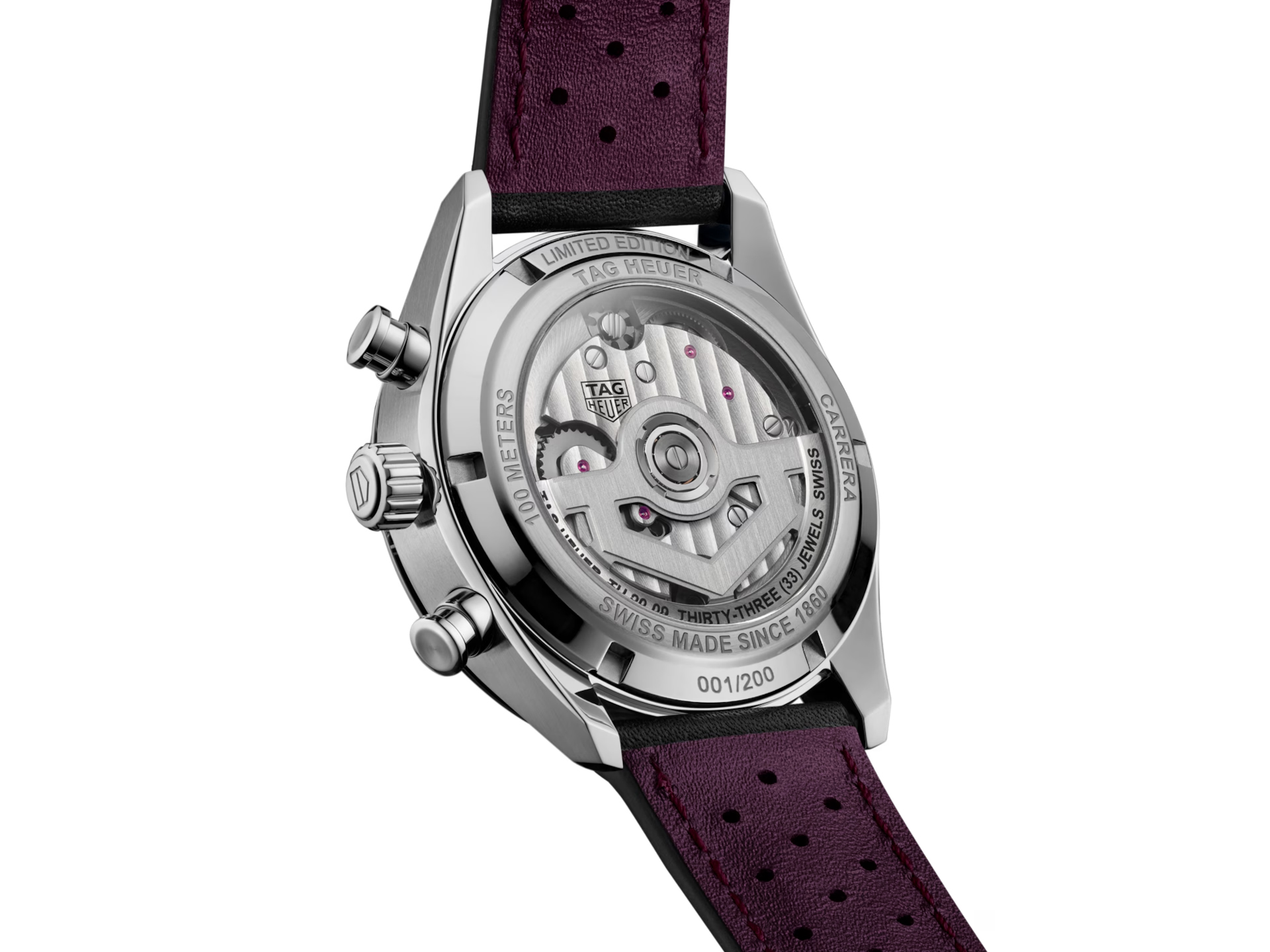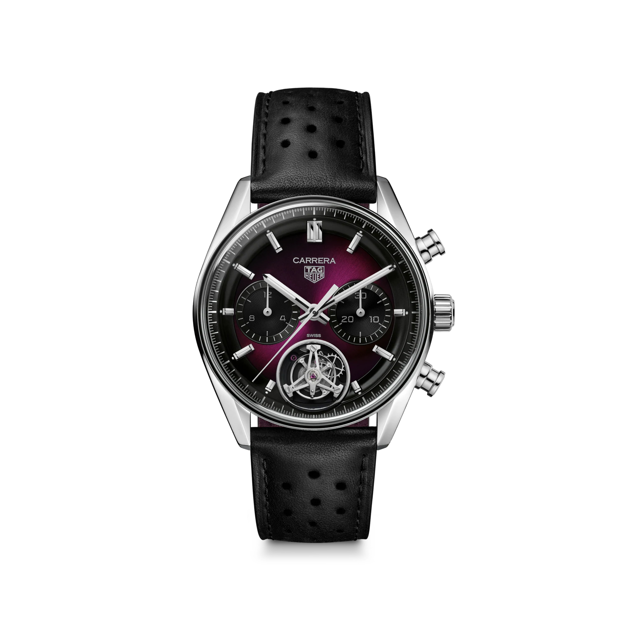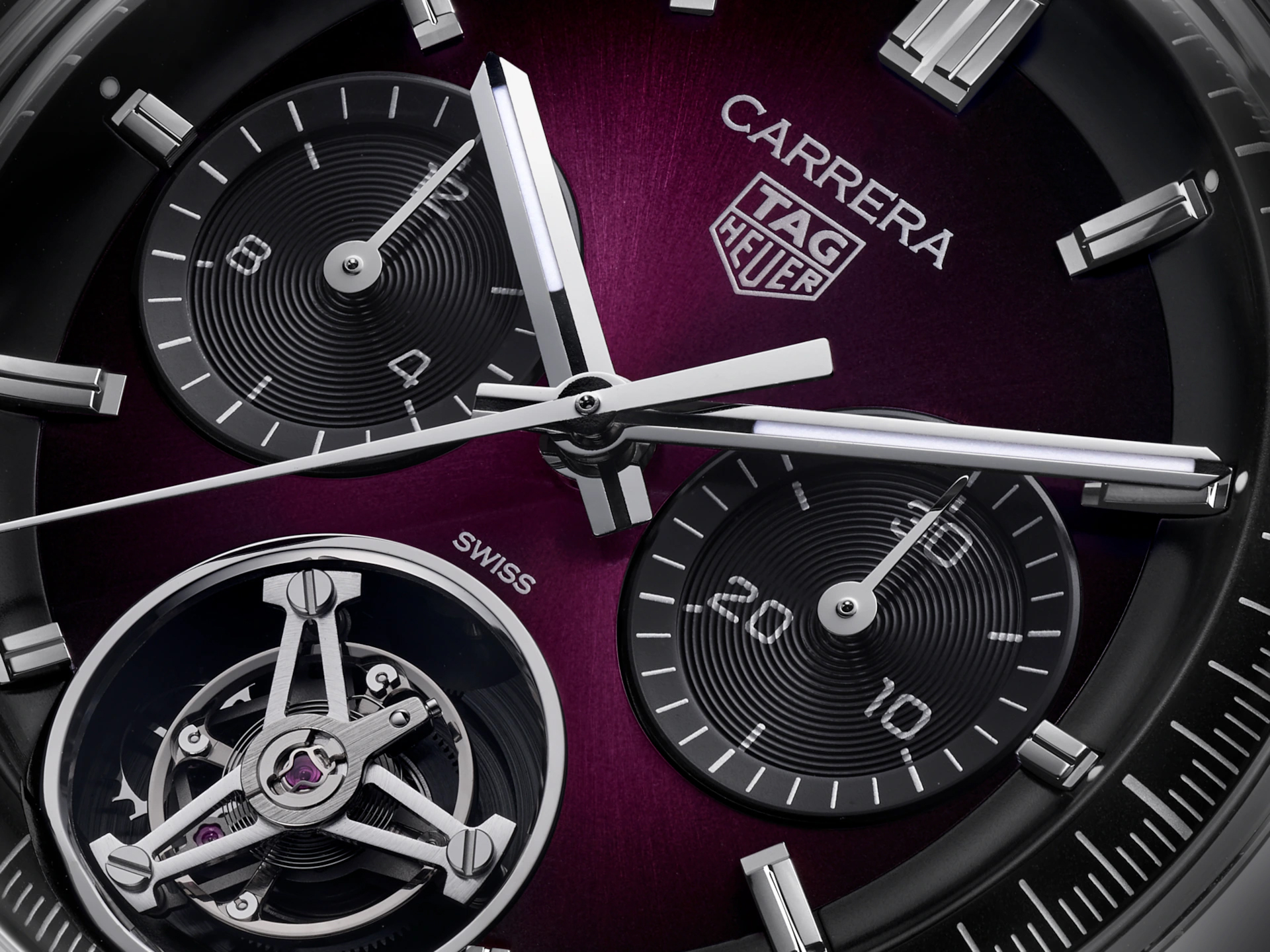 De TAG Heuer Carrera Chronograph Tourbillon combineert precisie en elegantie met een gedurfde nieuwe kleur. De smokey purple wijzerplaat met een geborsteld zonnestraalmotief afwerking en het in-house Heuer 02 (TH20-09) Tourbillon uurwerk vormen samen een limited edition horloge dat ongeëvenaarde verfijning biedt voor de moderne horlogeliefhebber.