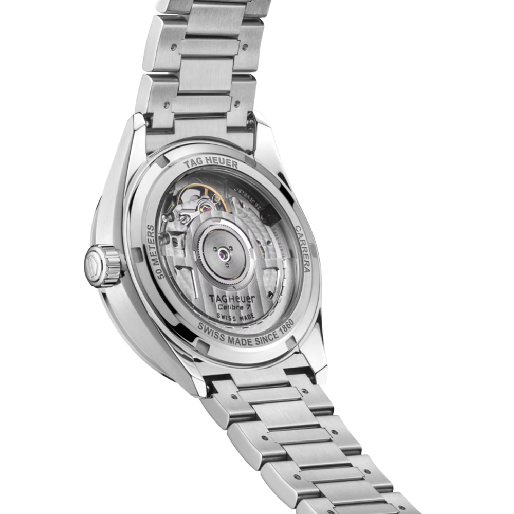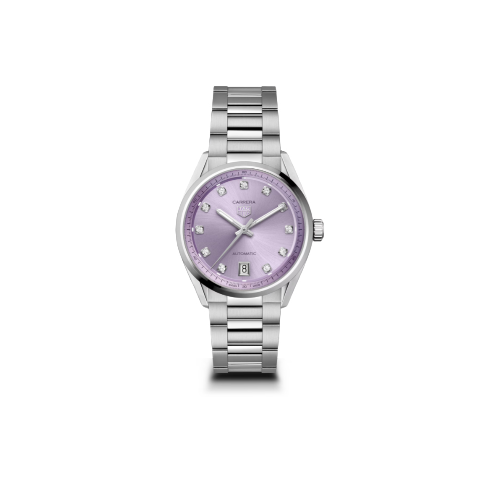 De TAG Heuer Carrera Date in 36 mm geeft de collectie een frisse touch met een betoverende lila wijzerplaat. Met diamanten bezette indexen en een Calibre 7-uurwerk combineert dit horloge elegantie met precisie.