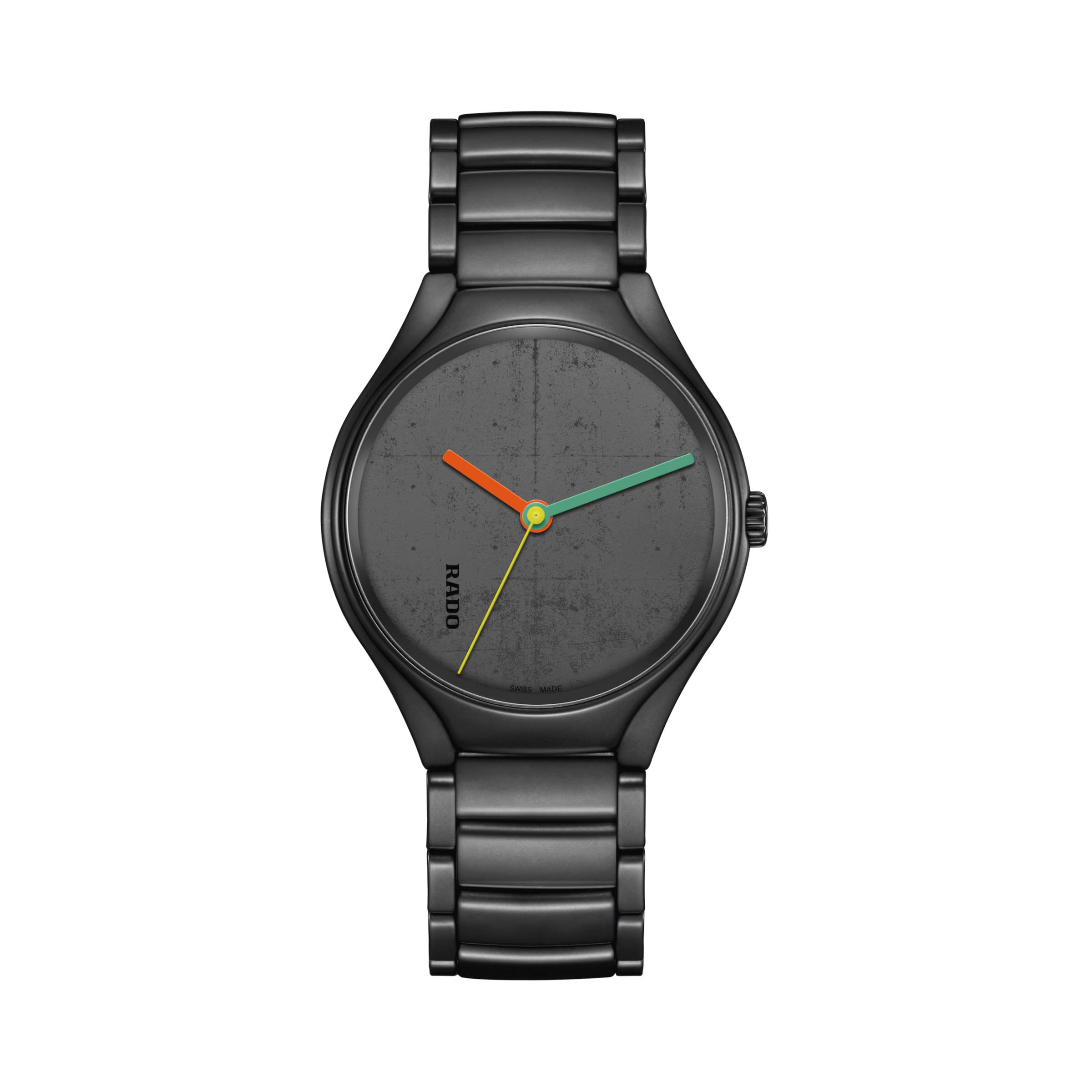 Een hightech keramische band en monobloc kast in mat NOIR D’IVOIRE (4320E) sluiten perfect aan bij de kleur uit Le Corbusier’s Polychromie Architecturale en bevestigen Rado als de Master of Materials. Ze staan bovendien garant voor een hoog draagcomfort. Het gebogen saffierglas en de hightech keramiek zorgen ervoor dat het horloge zijn als-nieuw uitstraling behoudt. Een anti-reflectiecoating aan beide zijden van het glas biedt een helder zicht op de wijzerplaat, die met laser is gegraveerd met een abstracte weergave van de betonnen oppervlaktetextuur van het Palace of Assembly in Chandigarh (India). Het Rado-logo staat verticaal op 8 uur.